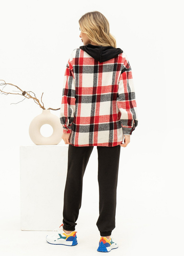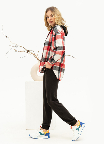 Спортивний костюм SA-449. Чорний костюм з картата байкова сорочка. Повсякденний костюм з капюшоном із картатої байки та чорної двонитки. Сорочка на ґудзиках з прямим вільним кроєм та подовженою спинкою. Виріб з довгими рукавами на манжетах та кишенею. Штани на гумці з резинками-манжетами та бічними кишенями. Виміри виробу: Напівобхват: Кофта: Груди: S (56), M (58), L (60), XL (62), Довжина виробу - 64, Рукав - 51, Штани: Талія: S (29-35), M (31-37), L (33-39), XL (35-41), Стегна: S (48), M (50), L (52), XL (54), Довжина виробу - 103, Довжина по внутрішньому шва - 77, Тканина: Низька еластичність. Матеріал - Подвох/байка. Склад тканини – 50% бавовна, 50% поліестер