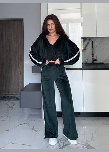 Костюм трійка, тканина основи якісний велюр, дуже приємний до тіла та дуже гарний образ Розміри: 42-44 та 46-48 Виміри за виробом (ще тягнеться) 42-44 ОГ-82/88 ОТ-62/70 ОБ-92/100 46-48 ОГ-86/96 ОТ-66/76 ОБ-96/104 Топік 42-44 ОГ-82/90, 46-48 ОГ-86/96 Довжина від пояса 107 см, крокова 81см, кофта по спинці 48 см, рукав від шиї 74 см Кольори: чорний, коричневий , зелений